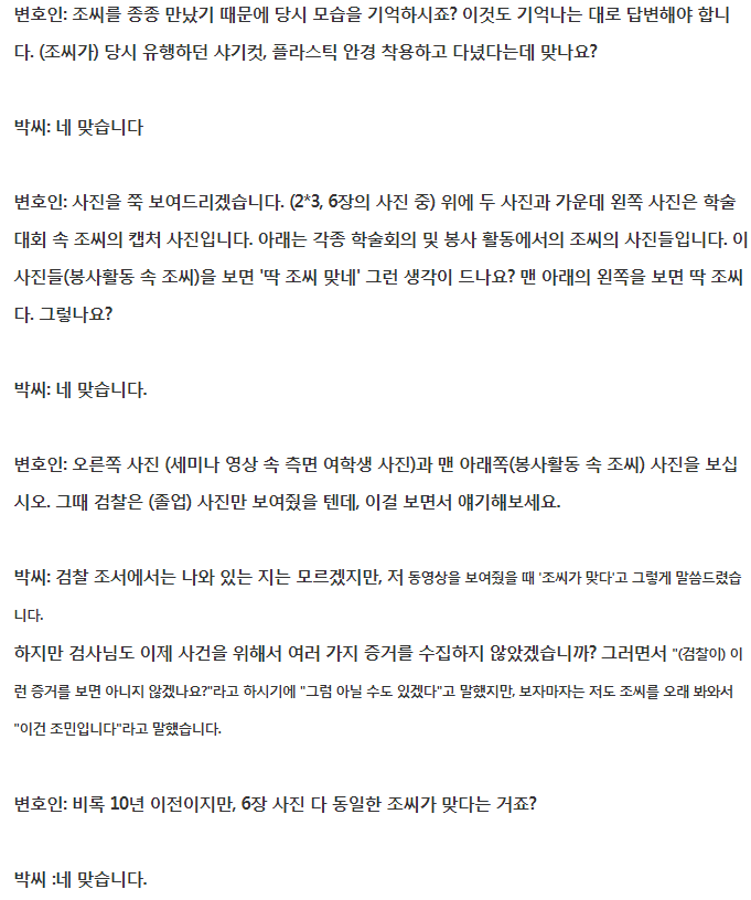 증언을 보면, 동영상을 본 박씨가 "이거 조민이다"라는 반응을 보였음에도 검찰은 아닐 가능성이 있냐는 취지로 되물어봤다는 것이다. 박씨는 1심에서도 검찰이 제시한 조민씨의 졸업사진과 영상 속 사진을 함께 보고 조씨와 비슷하다는 발언을 한 바 있다.