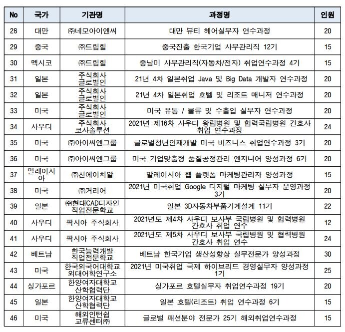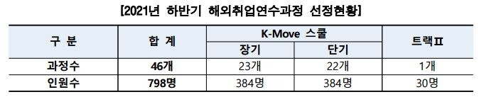 한국산업인력공단(이사장 어수봉, 이하 ‘공단’)은 17일부터 해외통합정보망 월드잡플러스(www.worldjob.or.kr)을 통해 2021년 하반기 해외취업 연수생을 모집한다. 이번에 선정된 46개 해외취업연수과정에서 연수생 798명을 순차적으로 모집하며, 해외취업 결격사유가 없는 만 34세 이하 청년 누구나 신청할 수 있다.
