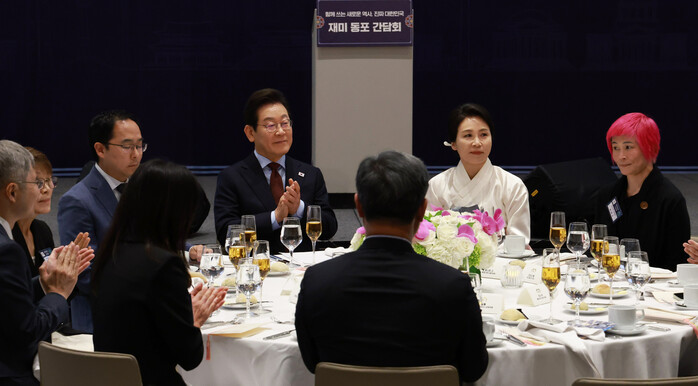 이날 간담회에서 이 대통령은 "무엇보다 한국인의 정체성을 소중히 간직하며 미국 사회의 모범적인 구성원으로 뿌리내린 여러분들이 한국과 미국 두 나라를 잇는 든든한 가교"라고 동포 사회를 격려했다.