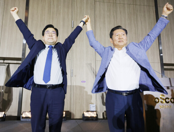 | ▲ 더민주혁신회의 전국대회 참석한 박찬대·정청래 의원 2025.6.29 (사진=연합뉴스) |