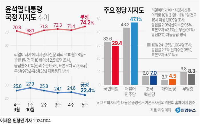 리얼미터가 에너지경제신문 의뢰로 지난 10월28일부터 1일까지 전국 18세 이상 유권자 2516명을 대상으로 한 조사(95% 신뢰수준에 표본오차 ±2.0%포인트) 결과, 윤 대통령의 국정 수행 긍정 평가는 22.4%로 직전 조사보다 2.2%포인트(p) 내린 것으로 나타났다. 윤 대통령 취임 이후 가장 낮은 지지율 수치다.