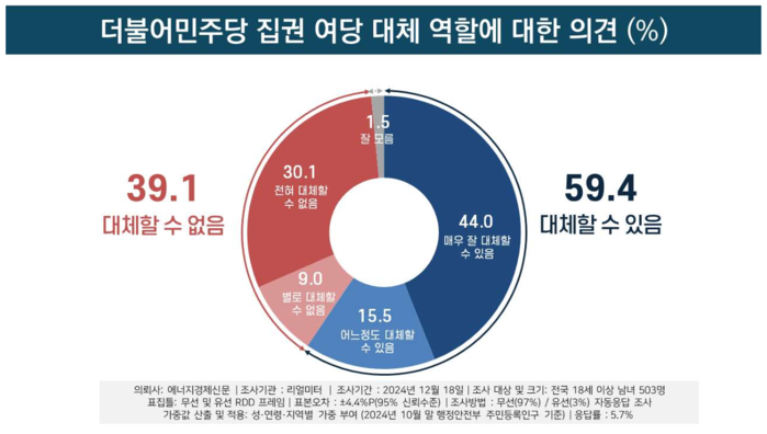 더불어민주당이 집권 여당 역할을 대체할 수 있다는 의견은 PK 지역을 제외한 대부분 지역, 모든 연령대, 진보층에서 높게 나타났다. 더불어민주당이 최근 제1야당으로서 국정안정협의체 구성을 제안하는 등 정권 교체를 위한 행보를 보이는 가운데, 민주당이 집권 여당을 할 수 있다는 의견이 59.4%로 나타났다. 구체적으로 "매우 잘 대체할 수 있음"이라는 응답이 44.0%, "어느 정도 대체할 수 있음"이라는 응답이 15.5%로 나타났다.