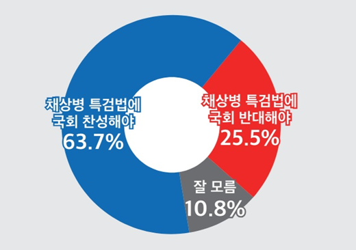 "특검법 통과에 반대해야 한다"는 응답은 25.5%에 불과해 '찬성' 의견이 두 배 이상 높았다. "잘 모르겠다"며 응답을 유보한 층은 10.8%다.