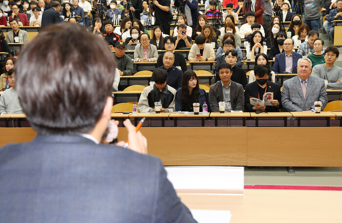 공개 행사에서 일종의 수사적 질문을 던진 셈인데, 객석에 있던 인 위원장은 웃으며 "경청하러 왔다"라고 했다.