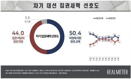야권에 의한 정권교체 50.4 % vs 정권 연장 44%