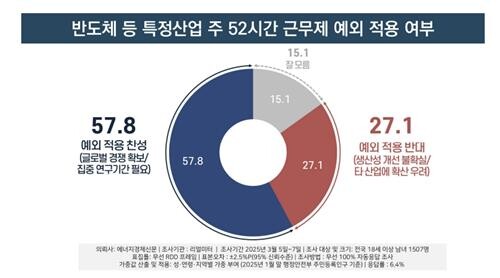 반도체 분야 연구·개발 인력에 대한 주 52시간 근무제 예외 적용과 관련해 찬성한 응답자는 57.8%, 반대는 27.1%로 집계됐다. '잘 모름'이라고 답한 비율은 15.1%였다.