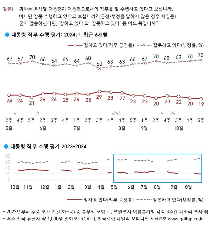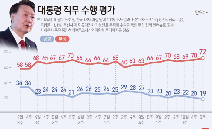 한국갤럽이 지난 29∼31일 전국 만 18살 이상 1005명을 전화조사원 인터뷰 방식으로 조사한 결과(표본오차는 95% 신뢰 수준에 ±3.1%포인트, 응답률 11.1%), 윤 대통령의 직무수행 긍정평가는 19%, 부정평가는 72%로 나타났다.