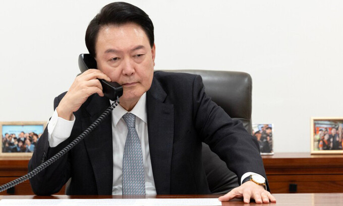 | ▲ 29일, 볼로디미르 젤렌스키 우크라이나 대통령과 전화 통화중인 윤석열 대통령 (사진 = 연합뉴스) |