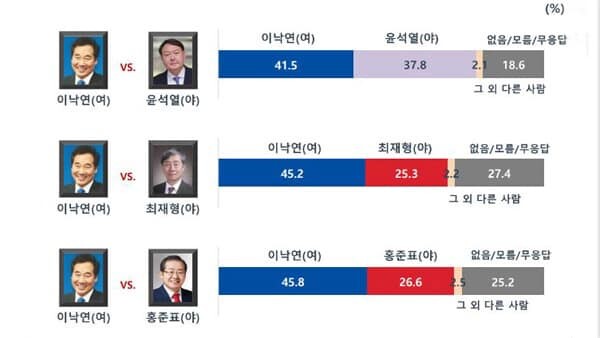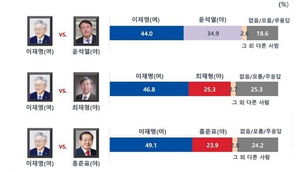 -가상 양자대결 이재명 44.0% vs 윤석열 34.9%..이낙연 41.5%vs 윤석열 37.8%.
