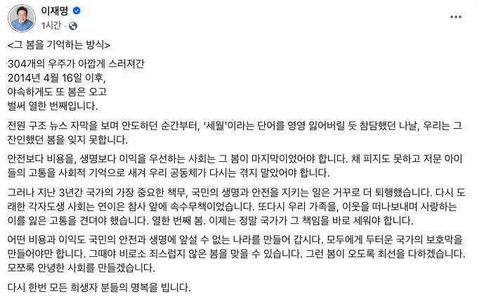 그러면서 "모두에게 두터운 국가의 보호막을 만들어야만 한다. 그때야 비로소 죄스럽지 않은 봄을 맞을 수 있다. 그런 봄이 오도록 최선을 다하겠다"며 "모쪼록 안녕한 사회를 만들겠다. 다시 한번 모든 희생자분들의 명복을 빈다"고 덧붙였다.
