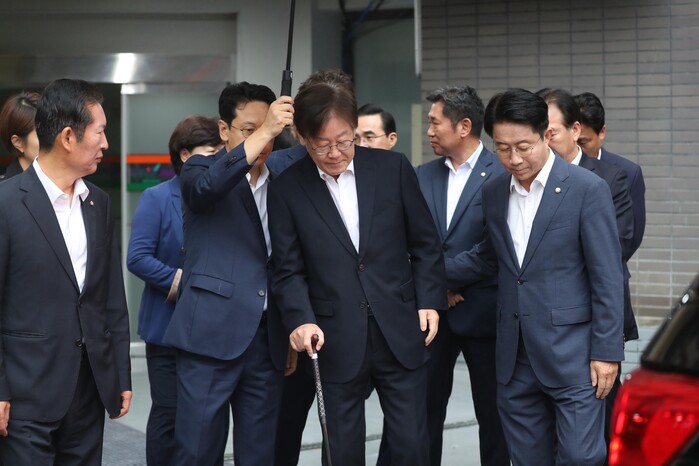 26일 오전 8시 30분 이 대표는 서울 중랑구 녹색병원에서 출발했다. 정장에 흰 셔츠, 노 타이 차림의 이 대표는 지팡이를 집고 걸음이 불편한 모습이었지만 옅은 미소를 띄우며 지지자들을 향해 손을 흔들어 주었다.