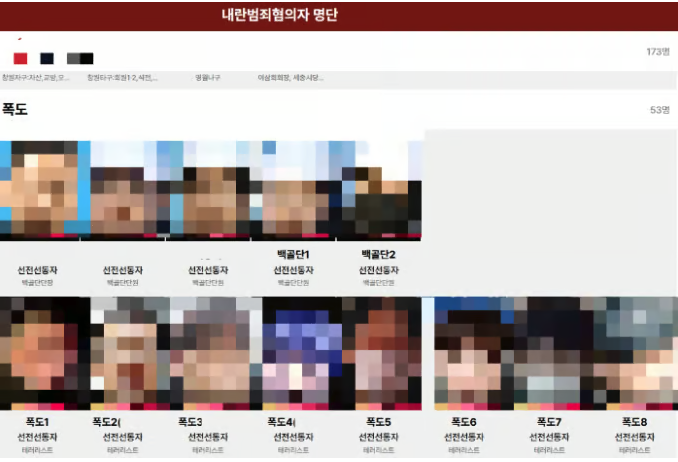 또 사이트에는 내란범죄혐의 명단이 수괴부터 군부, 경찰, 대통령실 등으로 구분되어 있고 윤석열의 비상계엄을 지지한 연예인 등 유명인의 신상도 게재됐다.