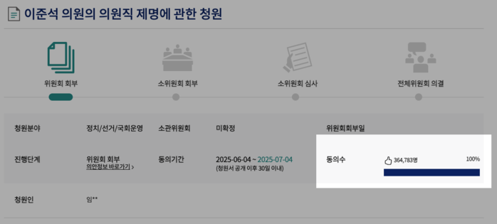 청원은 게시 후 30일 이내 5만 명 이상이 동의하면 성립되며, 이후 소관 상임위원회에 회부돼 심사를 받는다. 청원이 성립 요건을 채운 만큼 향후 국회는 이 의원에 대한 제명 여부를 논의할 전망이다. 청원의 소관위는 아직 정해지지 않았다.