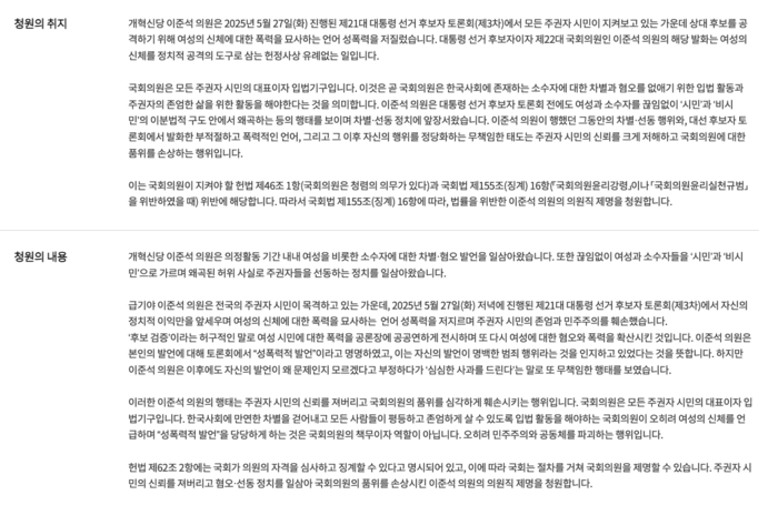 이어 "'후보 검증'이라는 허구적인 말로 여성 시민에 대한 폭력을 공론장에 전시하며 또다시 혐오와 폭력을 확산시켰다"고 지적했다. 그러면서 "이 의원은 이후에도 자신의 발언이 왜 문제인지 모르겠다고 부정하다가 '심심한 사과를 드린다'는 말로 또 무책임한 행태를 보였다"며 "주권자 시민의 신뢰를 저버리고 혐오·선동 정치를 일삼아 국회의원의 품위를 손상시켰다"는 이유로 의원직 제명을 요구했다.