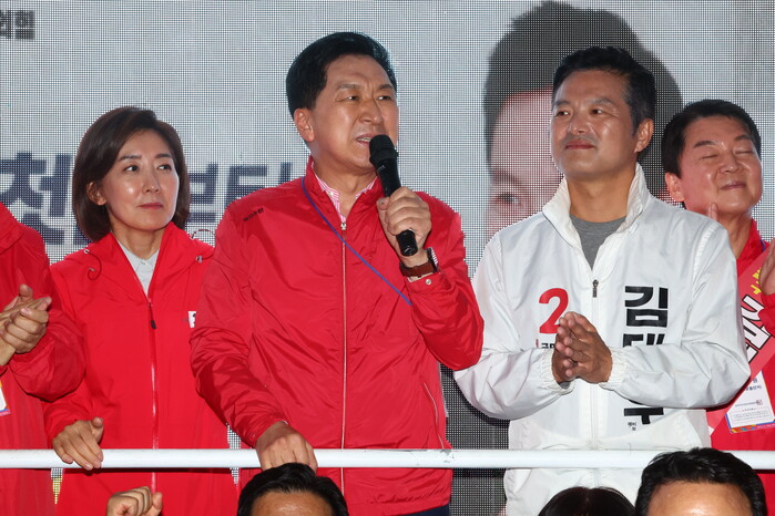 | ▲김태우 후보 지원유세에 나선 나경원, 김기현, 안철수 대표 (사진=연합뉴스) |
