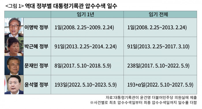 윤석열 정부는 작년 5월10일부터 올 5월9일까지 무려 193일 동안 대통령기록관을 압수수색했다.