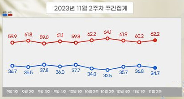 윤 대통령 국정 수행 지지도는 10월 3주 32.5% → 10월 4주 35.7% → 11월 1주 36.8% 등 상승세를 보이다 이번 11월 2주 조사에서 34.7%로 3주 만에 하락했다.