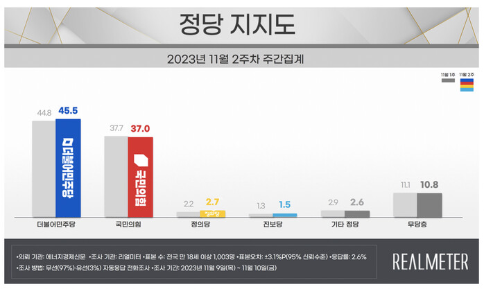 지난 9∼10일 전국 18세 이상 1천 3명을 대상으로 진행한 정당 지지도에서는 국민의힘이 0.7%p 하락한 37.0% 더불어민주당은 0.7%p 오른 45.5%로 집계됐다.