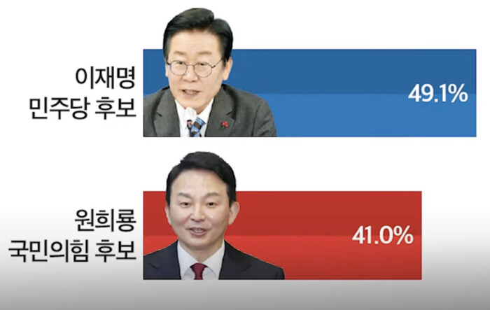 앞서 지난해 12월 9~10일 조사때 이재명 48.5% 대 원희룡 39.3%였던 것과 비교하면 격차가 다소 좁혀진 수치다.