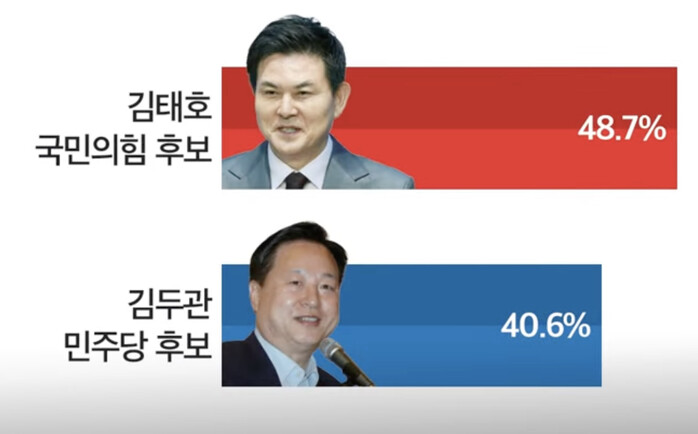 김태호 국민의힘 의원이 지역구를 옮기면서 격전지가 된 경남 양산을에서 김두관 더불어민주당 의원을 오차범위 내에서 앞서고 있다는 첫 여론조사 결과가 나왔다.
