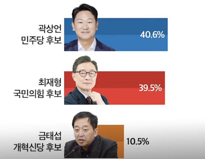 미디어 토마토의 여론조사결과 곽상언 후보가 등판할 경우 곽상언 40.6%, 최재형 39.5%, 금태섭 10.5%로 곽상언 후보가 오차범위내에서 앞서는 것으로 드러났다.