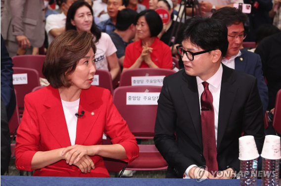 | ▲ 국민의힘 한동훈 전 대표와 나경원 의원. 사진은 2024.7.8 전당대회 합동연설회 (사진=연합뉴스) |