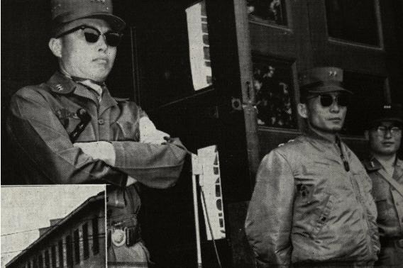 | ▲ 1960.5.18 육사생도의 5.16지지 시위를 지켜보는 (왼쪽부터) 박종규 소령, 박정희 소장, 차지철 대위 (제공=연합뉴스) |