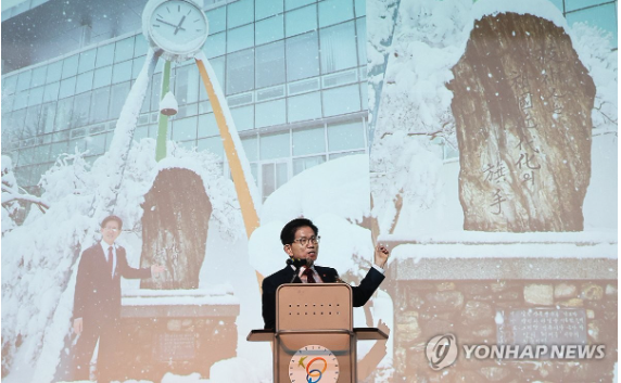 | ▲ 박정희 휘호비 배경으로 한국폴리텍대학 서울정수캠퍼스 졸업식 축사하는 김문수 후보 2025.2.5(사진=연합뉴스) |