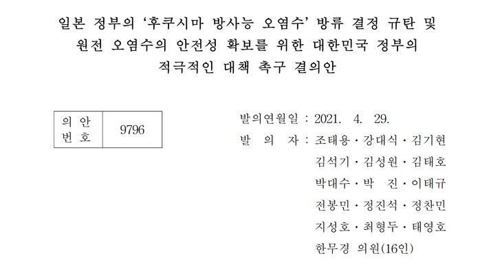 김 대표가 서명한 결의안에는 “후쿠시마 오염수에는 인체에 치명적인 삼중수소를 비롯하여 60여 종의 방사성 물질이 포함되어 있는데 완전한 제거가 어렵다는 것이 전문가들의 의견”이라고 쓰여져 있다.