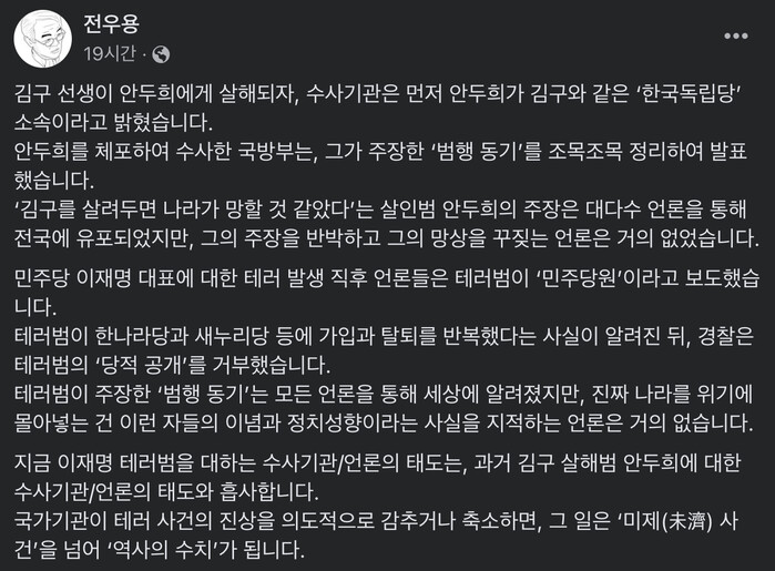 역사학자 전우용 박사가 이재명 테러범과 관련하여 김구 살해범인 안두희를 대하는 태도와 흡사하다며 수사기관과 언론의 태도를 지적했다.