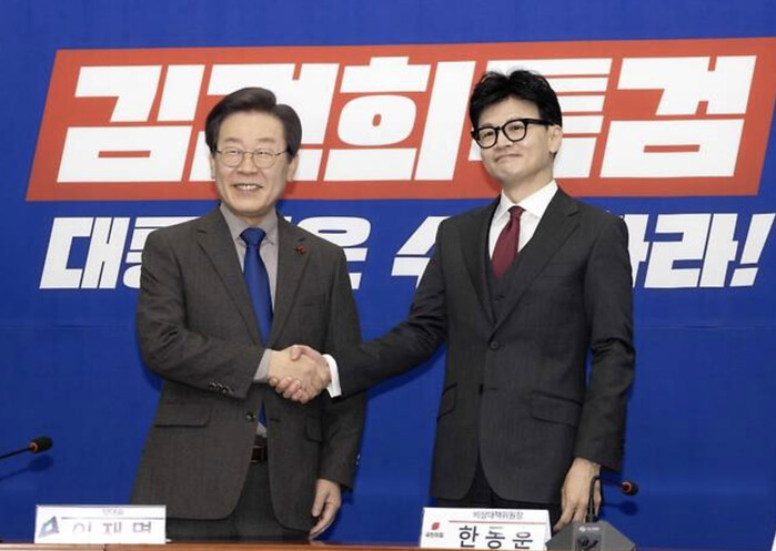 | ▲비대위원장 취임후 민주당 찾은 한동훈 대표, 맞이하는 이재명 대표 (사진=연합뉴스) |