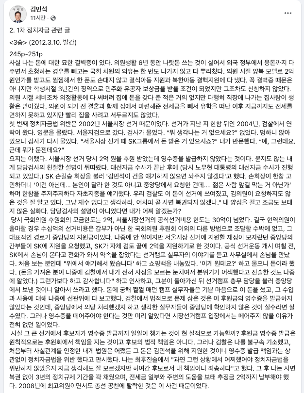 특히 2002년 서울시장 선거와 관련해 자신이 연루된 '1차 정치자금법 사건'에 대해 "누가 왜 요구한 정치자금인지도 불명확한 표적 사정 사건"이라며 "2002 서울시장 후보이던 저도 모르게 중앙당이 요청했던 선거 지원용 기업 후원금의 영수증 미발급 책임을 후보인 내게도 물은 이례적 사건"이라고 말했다.