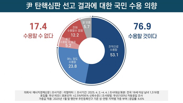 헌법재판소의 윤석열 탄핵 심판 선고 결과에 대한 수용 의향 여부를 조사한 결과 받아들인다고 응답한 비율은 76.9%, 받아들이지 않는다는 것은 17.4%로 집계됐다.
