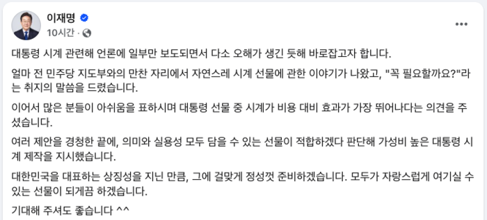 이 대통령은 "얼마 전 민주당 지도부와의 만찬 자리에서 자연스레 시계 선물에 관한 이야기가 나왔고, '꼭 필요할까요'라는 취지의 말씀을 드렸다"고 설명했다.