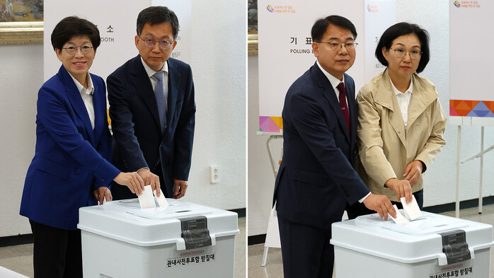 | ▲금정구청장 후보인 진보 단일 김경지 후보 부부와 윤일현 국민의힘 후보 부부 (사진=연합뉴스) |