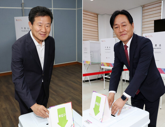 | ▲강화군수 후보로 나온 한연희 더불어민주당 후보와 박용철 국민의힘 후보 사전투표 모습(사진=연합뉴스) |