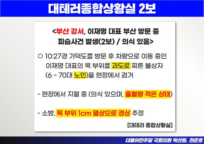 이와 함께 국무조-정실 대테러상황실이 발송한 초기 상황보고 문자에서 범인을 '노인', 흉기를 '과도', 피해를 '출혈 적음' 등으로 사실과 다르게 표현하며 사건의 심각성을 의도적으로 축소했다고 비판했다.