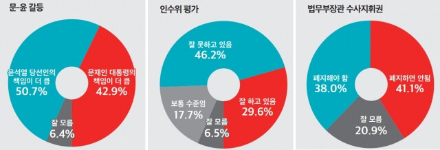 응답자 50.7%는 ‘윤 당선의 책임이 더 크다’고 답했다. ‘문 대통령의 책임이 더 크다’는 42.9%였다. 6.4%는 잘 모르겠다고 답했다.