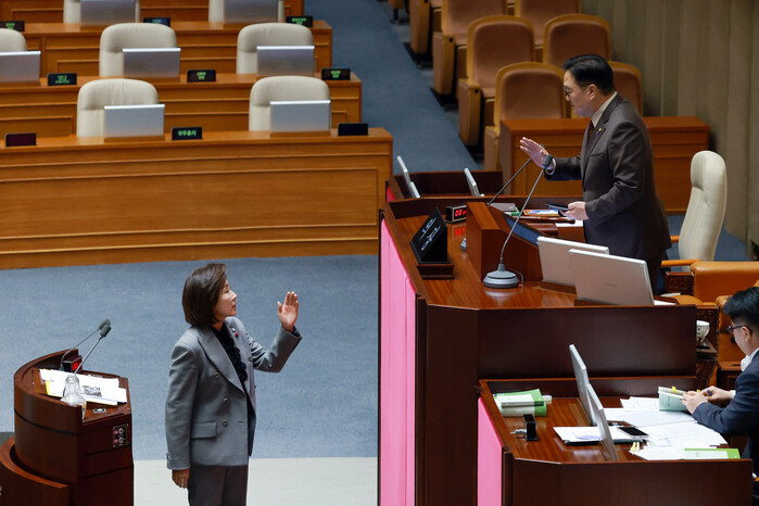 | ▲ 9일 국회 본회의에서 국민의힘 나경원 의원이 가맹사업거래의 공정화에 관한 법률 일부개정법률안에 대해 무제한 토론을 하는 도중 우원식 국회의장이 의제와 관련 없는 토론을 한다며 마이크를 꺼버리자 나 의원이 항의하고 있다. 2025.12.9 (사진=연합뉴스) |