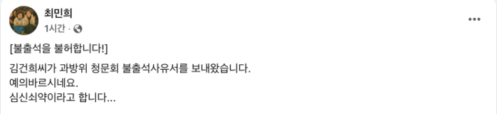 | ▲ 김건희가 제출한 불출석 사유서 (출처=최민희 페이스북) |