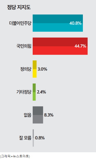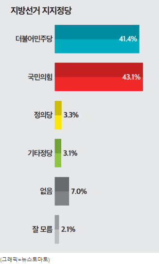 -6월 지방선거 지지 정당후보, 국민의힘 43.1% 대 민주당 41.4%.