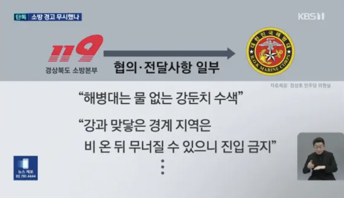 한편, KBS는 소방 당국이 강 경계 지역 진입금지를 경고했었고 이를 해병대가 무시해서 발생한 사건이라고 단독보도를 통해 알렸다.