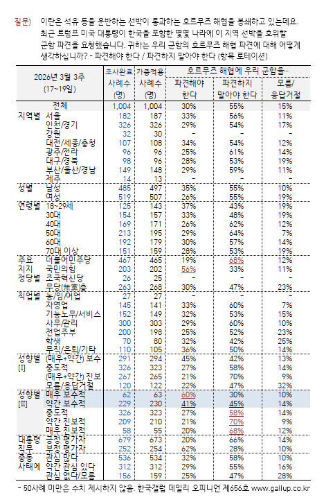 한국갤럽이 17~19일 전국 성인 1004명을 대상으로 실시한 조사에 따르면, 호르무즈 해협에 우리 군함을 파견하는 데 대해 55%가 반대 의견을 밝혔다. 찬성은 30%에 그쳤고 15%는 의견을 유보했다.