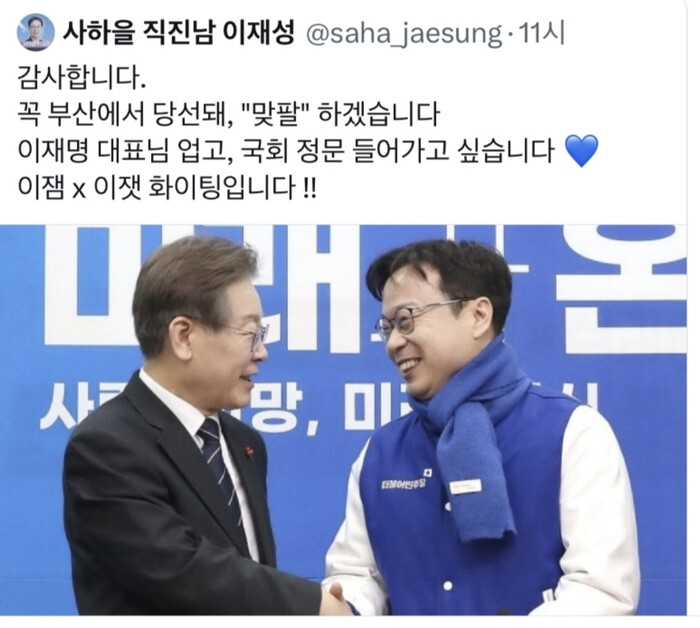 이에 이재성 후보는 "꼭 부산에서 당선돼 이재명 대표님 업고 국회 정문 들어가고 싶다"고 화답했다.