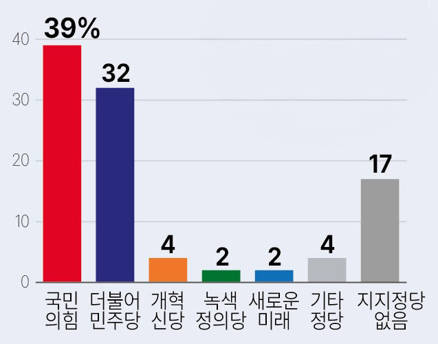 개혁신당 4%, 녹색정의당 2%, 새로운미래 2% 순이었다. 지지 정당이 없다는 응답은 17%였다.