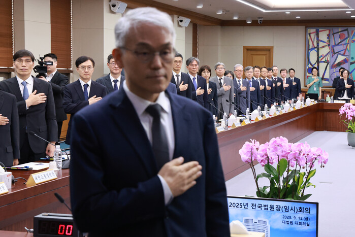 | ▲ 각급 법원장들이 12일 서울 서초구 대법원에서 열린 전국법원장회의 임시회의에서 국기에 경례하고 있다. 2025.9.12 (사진=연합뉴스) |