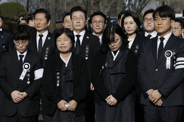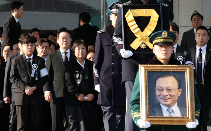 | ▲ 이재명 대통령 부부와 이해찬 전 총리 유가족 등이 31일 서울 여의도 국회 의원회관에서 열린 이 전 총리 영결식에서 영정행렬을 바라보고 있다. 2026.1.31 (사진=연합뉴스) |