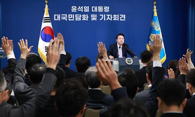 윤석열 대통령은 7일 오전 열린 대국민 담화 및 기자회견에서 김건희 여사 국정농단에 대해 전면 부인하며 김 여사를 두둔했다.