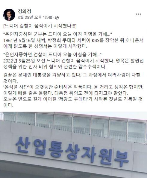 "은인자중하던 검찰이 드디어 오늘 아침을 기해...", "2022년 3월25일 오전 드디어 검찰이 움직이기 시작했다. 명목은 탈원전 정책을 위한 인사 비위 혐의와 관련한 압수수색이다"라는 글을 올렸다.