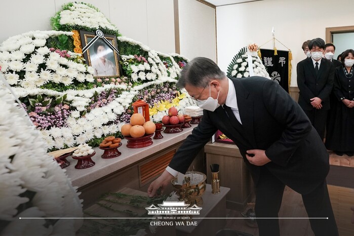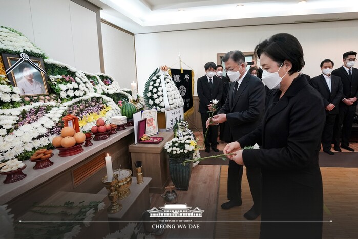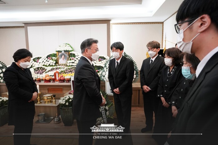 고인이 또 다른 아들이라고 불렀던, 더불어민주당 우상호 의원과 유가족들에게도 위로의 말을 건넸다. 문 대통령은 조문 후 평소 고인과 인연이 깊었던 민족민주유가족협의회(유가협) 유족들과도 인사했다.